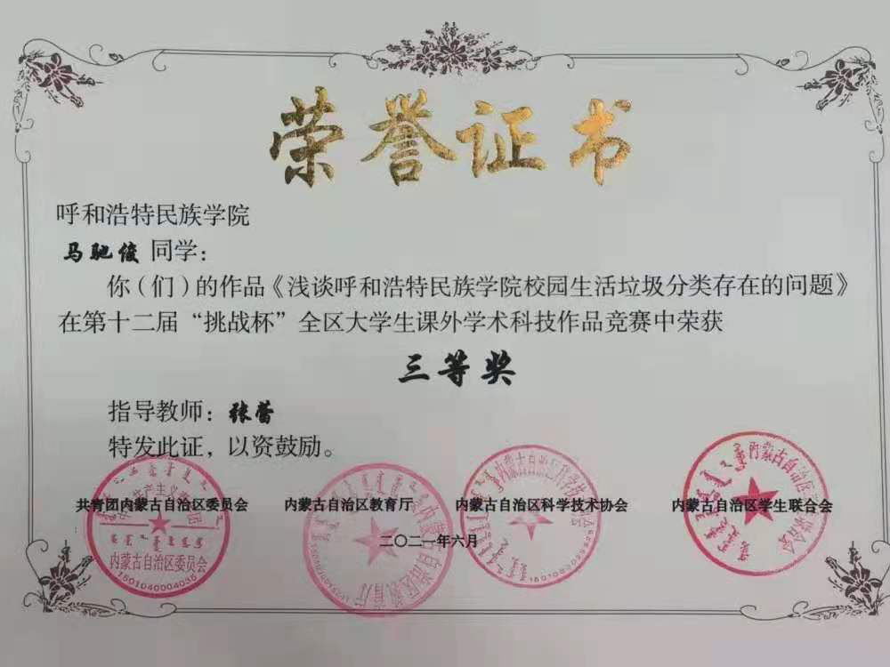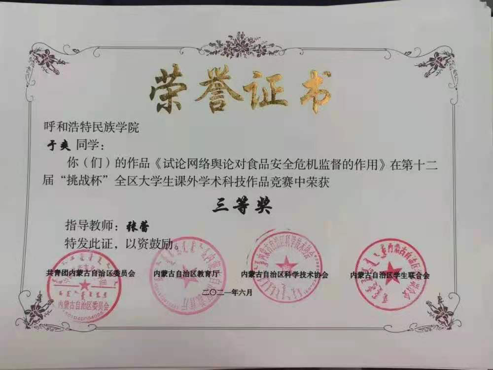 由共青团内蒙古自治区委员会、内蒙古自治区教育厅、内蒙古自治区科学技术协会和内蒙古自治区学生联合会主办的第十二届“挑战杯”全区大学生课外学术科技作品竞赛中我院学生喜获佳绩。学院教工党支部深入贯彻落实党史学习教育部署要求,党员教师亮出身份、履行职责,为学生们提供竞赛指导,筑梦成长。在张蕾老师和代阳老师的精心指导下,我院于爽同学的参赛论文《试论网络舆论对食品安全危机监督的作用》、马驰俊同学的参赛论文《浅谈YABO鸭脖学生校园生活垃圾分类存在的问题》和宁喜强同学的参赛论文《校园暴力中的隐性领导者》在本次比赛中分别荣获“三等奖”。