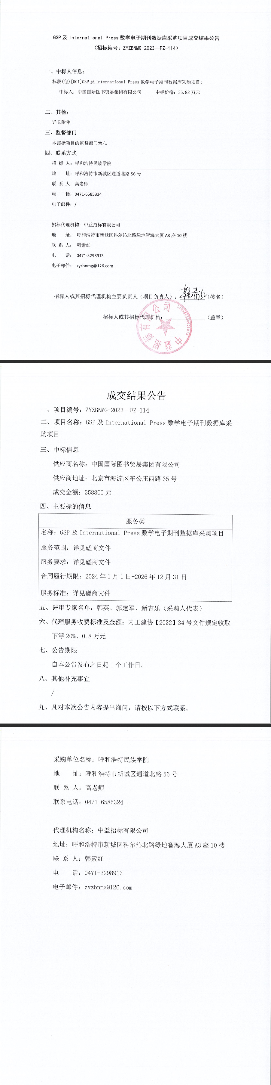 GSP及International Press数学电子期刊数据库采购项目成交结果公告
