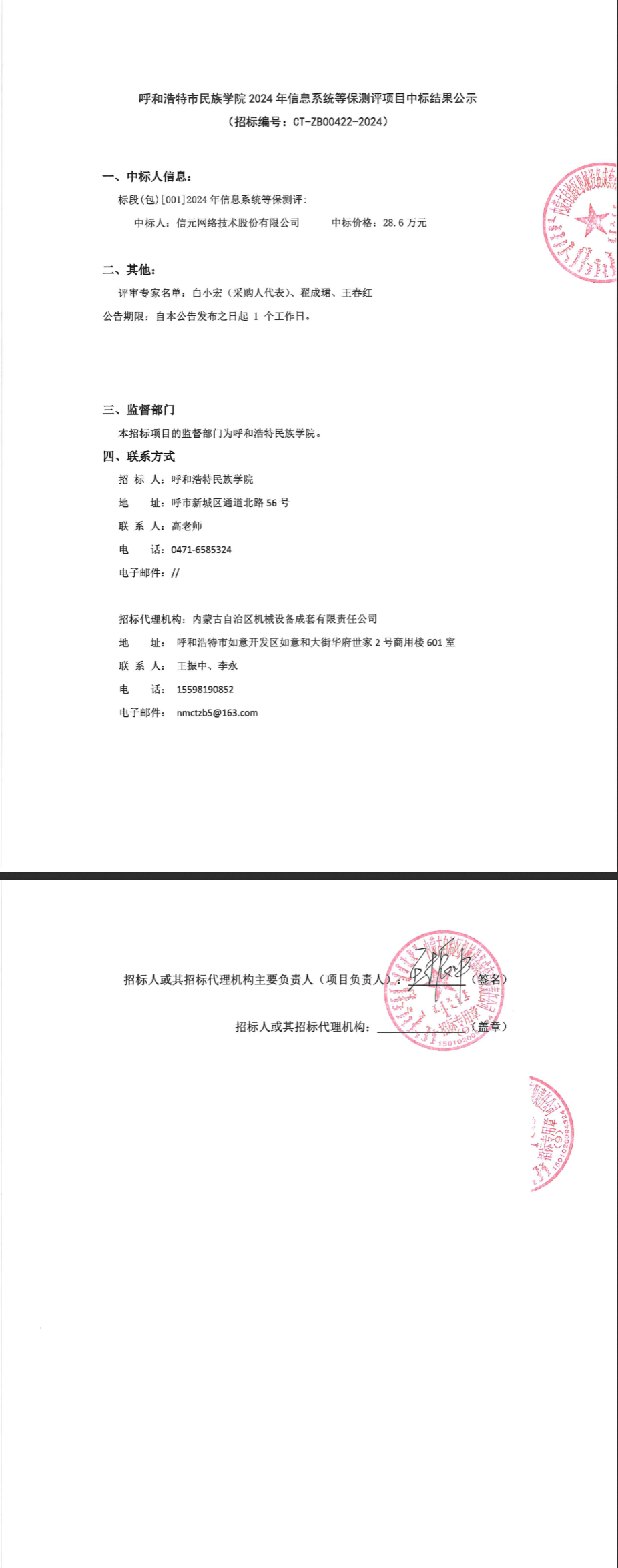 呼和浩特市民族学院2024年信息系统等保测评项目中标结果公示