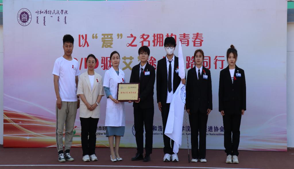 活动中,呼和浩特阳光工作组阿金同志和学校后勤管理处医务所所长刘晋雯同志分别向学校健康促进协会授牌授旗,并寄语同学们在防艾志愿服务活动路上坚持到底。