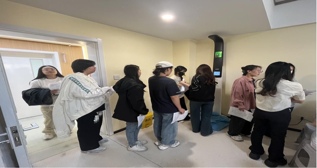 学校联合体检单位提前制定方案,通过分批次错峰体检、优化流程指引、划分功能区域等措施,确保每日的体检工作高效有序开展。医护团队严格执行规范操作,为新生完成形体生理功能、内外科、眼耳鼻喉、口腔等基础检查,同步开展血常规、肝功及结核菌素试验等项目检测,全面覆盖生长发育、基础体征与感染筛查需求。现场设立应急服务站应对突发状况,为特殊需求学生开通绿色通道,并安排志愿者协助信息核对与流程引导,以专业服务与人文关怀保障体检顺畅进行。
