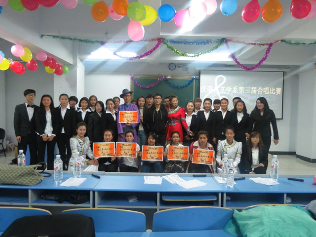 为了丰富同学们的课余文化生活,增强同学们的集体荣誉感。汉语言文学系团总支于2014年11月1日晚在学院新教学楼418教室组织举办“音乐点亮青春、歌声唱响未来”合唱比赛,本次活动由系团总支组织,全系近300名学生参加了本次活动。