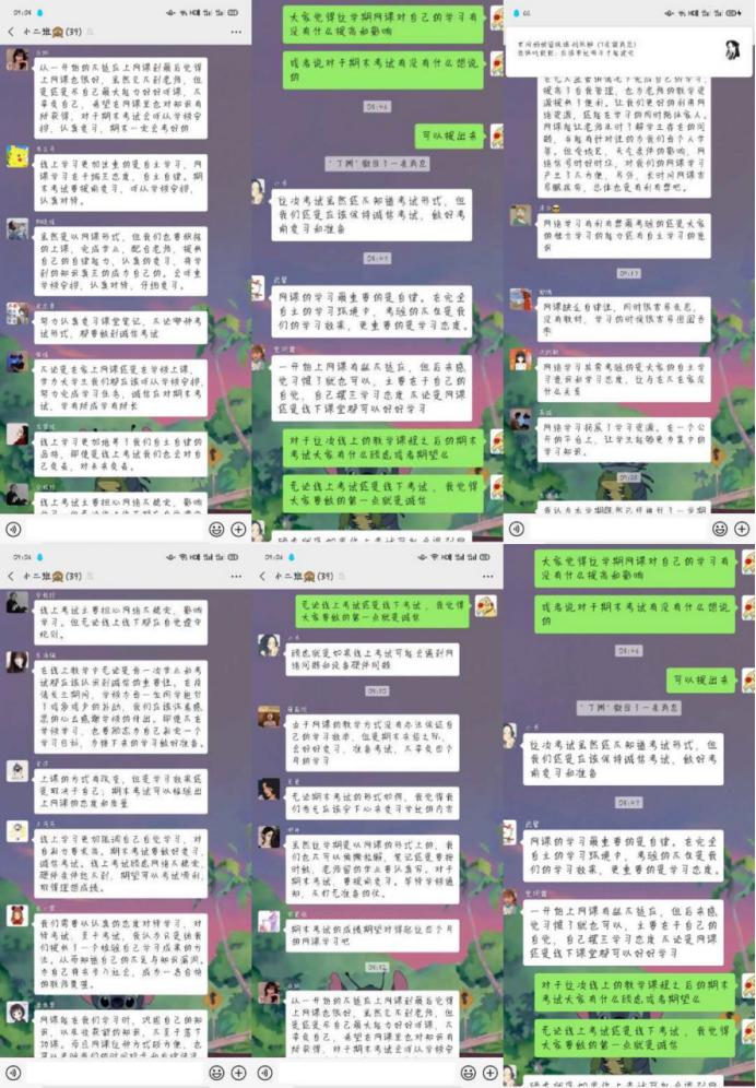 为贯彻落实学校《关于举办2020年“资助育人文化节”的通知》(呼和民院学字[2020]29号)的文件精神,文学院于6月18日-6月28日期间组织各班级利用钉钉平台召开“资助-感恩-诚信”系列主题班会。会上,同学们表达了对国家、学校给予资助的感恩之情,共同探讨了诚信考试的重要性,表达了要端正态度,认真严肃对待考试的决心。