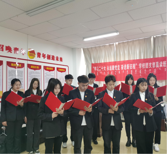 早晨7时,学生们着正装、佩戴团徽,精神饱满,朗朗的读书声传来,展现了我院学子学习党的二十大精神的热情。