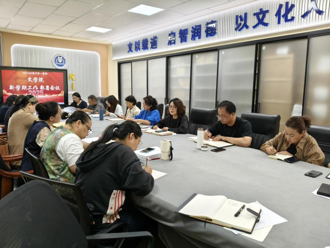 为确保2025年秋季学期各项工作高效有序开展,全面提升文学院整体教学质量,8月28日下午,文学院于会议室组织召开新学期工作部署会议。院长高娃主持会议,党总支副书记包冬梅和全院教师参会。