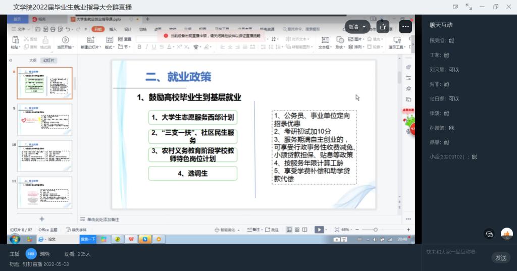 为帮助同学们解决就业过程中的实际问题,提升就业质量,文学院于6月8日晚,通过钉钉平台线上召开2022届毕业生就业指导培训会。会议由文学院2位辅导员主持,全体2022届毕业生参会。