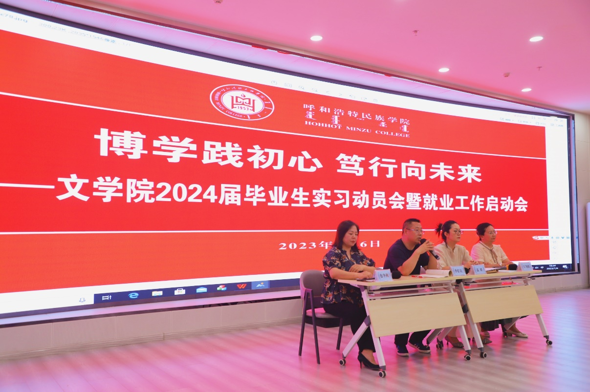 毕业实习是学生能够顺利就业、走上工作岗位奠定坚实基础的必备专业素养和职业技能。为圆满完成实习任务,践行教书育人的初心。7月6日下午,文学院召开“2024届毕业生实习动员会暨就业工作启动会”,文学院党总支书记李宏亮、副院长高娃、党总支副书记包冬梅、文学教研室主任乌兰哈斯及2024届毕业班班主任和学生代表共150余人参加。会议由文学院党总支副书记包冬梅主持。