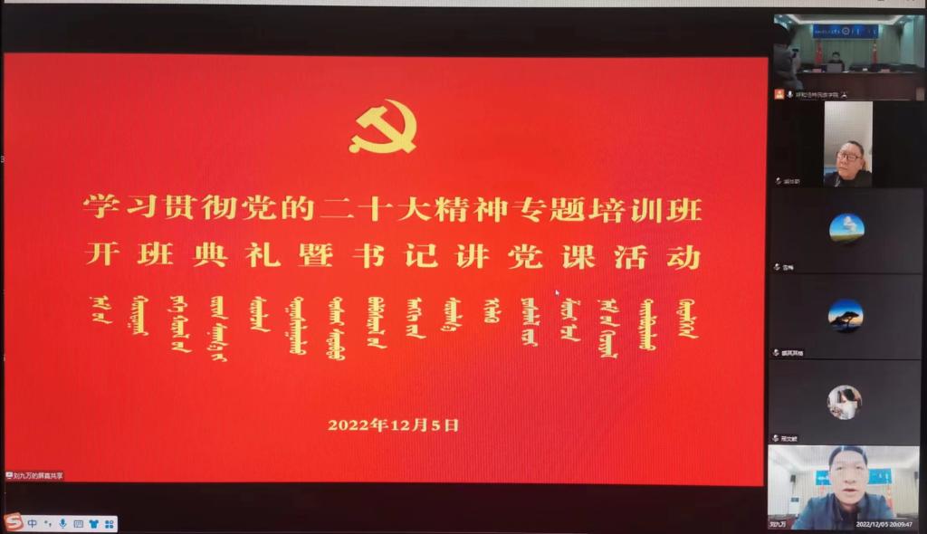 12月5日,学校举办学习贯彻党的二十大精神专题培训班开班仪式暨党委书记讲党课活动。刘九万以《在中国式现代化的新征程上奋勇前进》为题,为二十大精神专题培训班全体学员讲授开班第一课。全校副处级以上领导干部、思政课教师和宣讲团成员参加培训。党课采取线上线下相结合的方式,主会场设在办公楼4楼会议室,分会场设在腾讯会议室。专题培训班开班仪式暨党课由韩伟新主持。