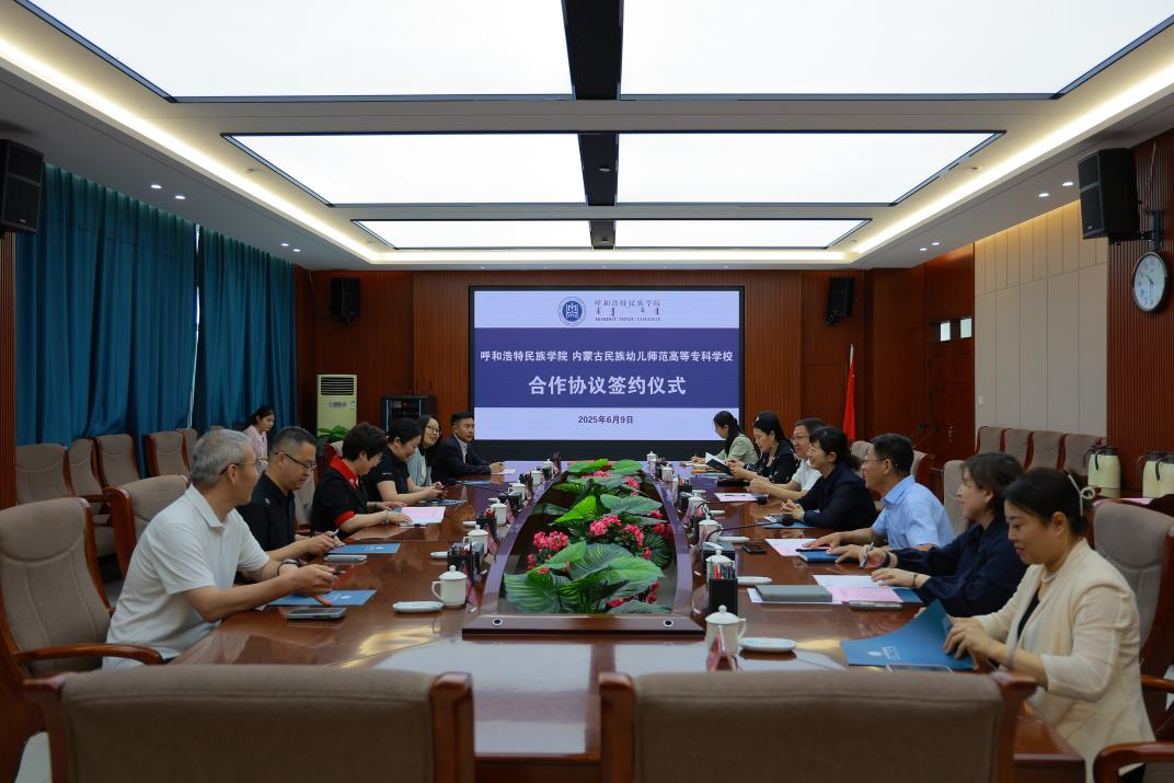 6月9日,内蒙古民族幼儿师范高等专科学校党委副书记、校长李春晖一行来校考察调研并签署合作协议。校党委书记刘九万在学校铸牢中华民族共同体意识教育馆与李春晖一行作了深入交流。党委副书记、校长王敏,党委委员、副校长高喜天,党委委员、副校长刘瑞鸿出席了签约仪式。会议由高喜天主持。