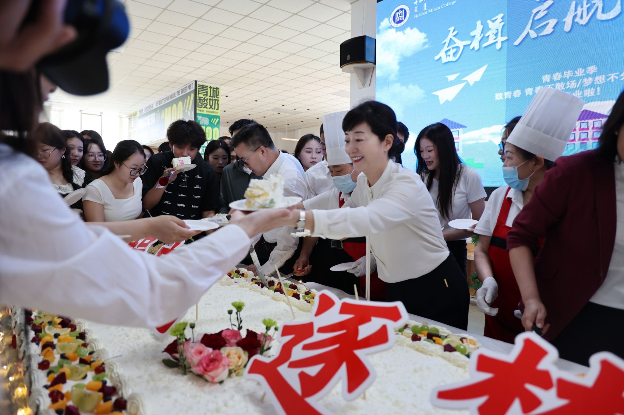为表达对毕业生的关怀与祝福,学校精心筹备,为大家准备了免费的水果、饮料和蛋糕。水果新鲜欲滴,饮料种类丰富,蛋糕造型精美,每一处细节都饱含着学校对毕业生的深情厚谊。