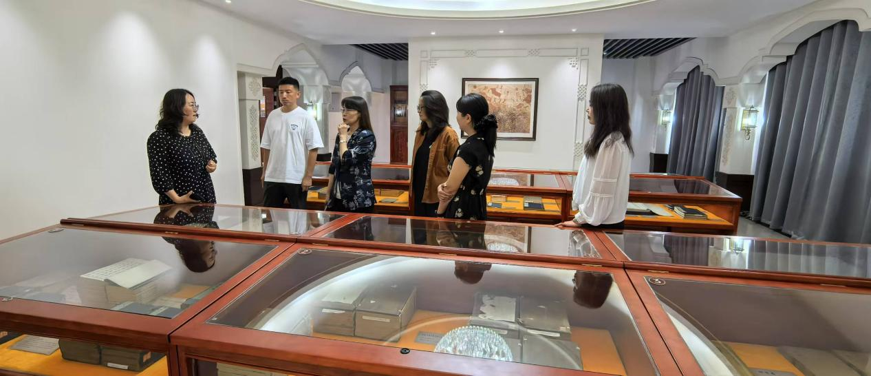 随后,刘明新一行来到图书馆,图书馆馆长郝喜凤详细介绍了图书馆概况、馆藏资源和读者服务等情况。双方就图书馆特色文献资源建设、服务质量提升、阅读推广活动和文化建设等方面的具体做法和各馆取得的成绩进行深度交流。接着刘明新一行参观了图书馆美育空间、特色专区、古籍文献展阅室和特藏文献展阅室等。