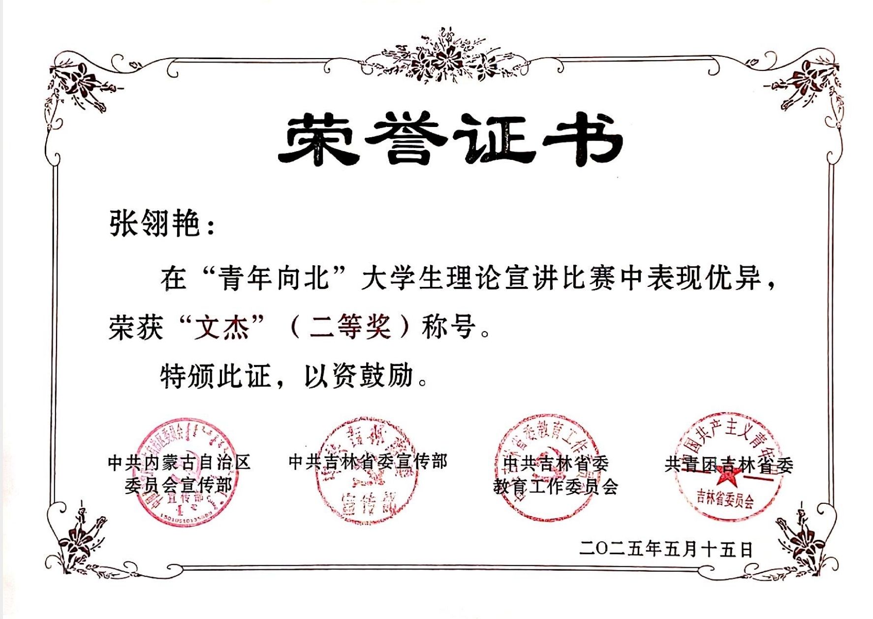 鸭脖新闻传媒学院2022级播音与主持艺术专业张翎艳同学,凭借宣讲作品《守望相助谱新篇》斩获“文杰”奖。文学院团总支书记刘晓获评优秀指导教师。宣讲比赛中,张翎艳同学以YABO鸭脖毛平老师与杭盖学长为切入点,生动讲述了鸭脖师生“守望相助”的民族团结故事。