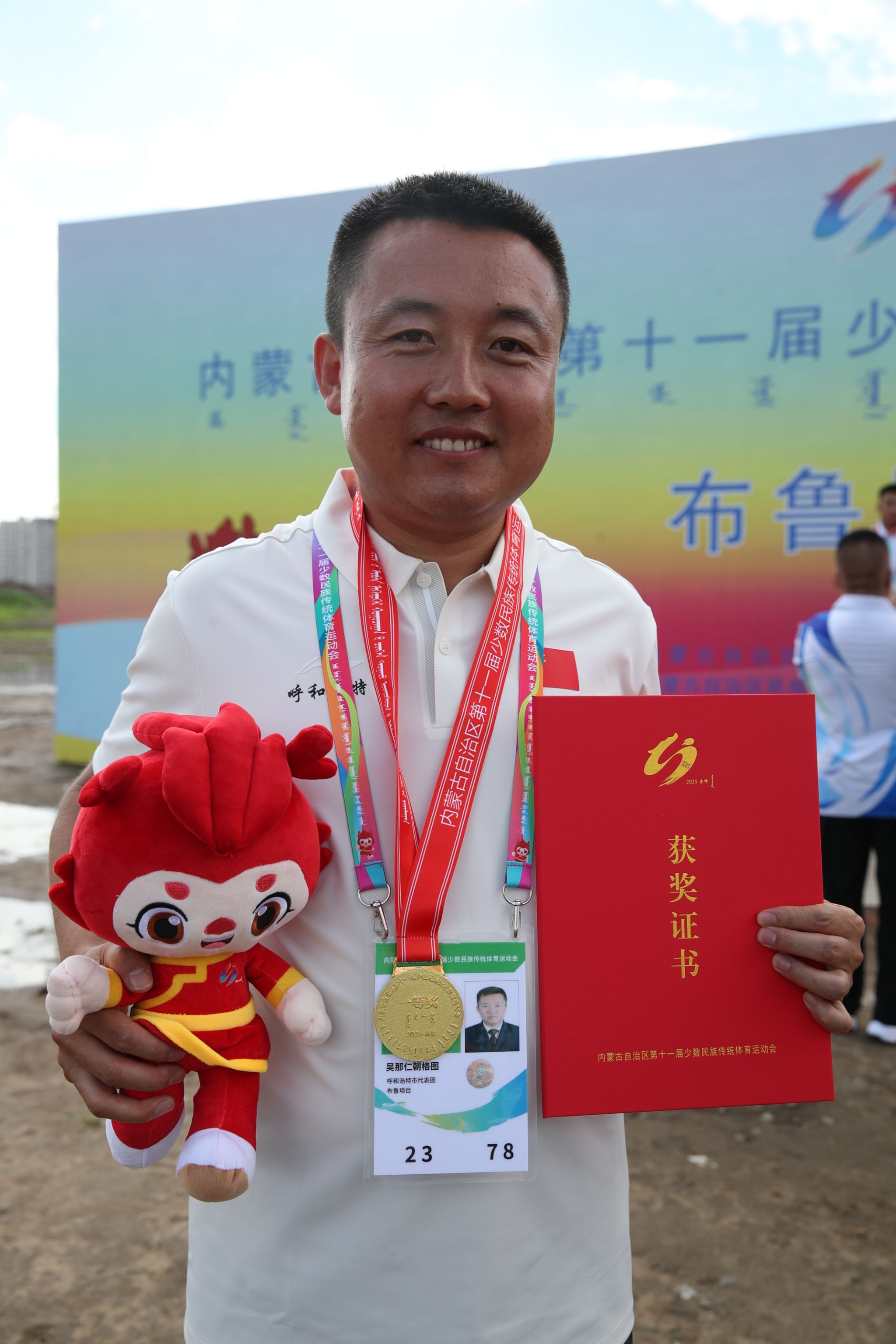 近日,内蒙古自治区第十一届少数民族传统体育运动会在赤峰市举行,7月27日,鸭脖吴那仁朝格图在布鲁掷准项目比赛中获得冠军。
