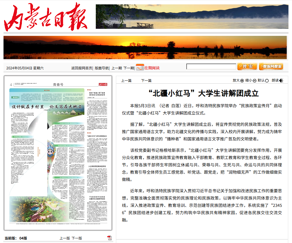 打造品牌团队。组建“北疆小红马”大学生讲解团,累计接待两馆两廊参观团525个,近4万人次来访;团队先后入选2024年全国大学生沂蒙精神志愿宣讲团、呼和浩特市民委“青城融讲”铸牢中华民族共同体意识讲解团、新城区民委铸牢中华民族共同体意识宣讲团,多次参与自治区民委、呼和浩特市民委大型宣讲活动。讲解团创新采用“讲解+演绎”模式,将民族团结进步故事与沂蒙精神带入中小学、企业及乡村振兴帮扶点;通过“大手拉小手”培养红领巾讲解员,推动思政教育在不同学段的内容衔接与协同育人。团队“课本剧里的红色北疆”创新项目,在学校“北疆文化创新大赛”中荣获特等奖,将国家通用语言文字推广与思政教育有效融合。