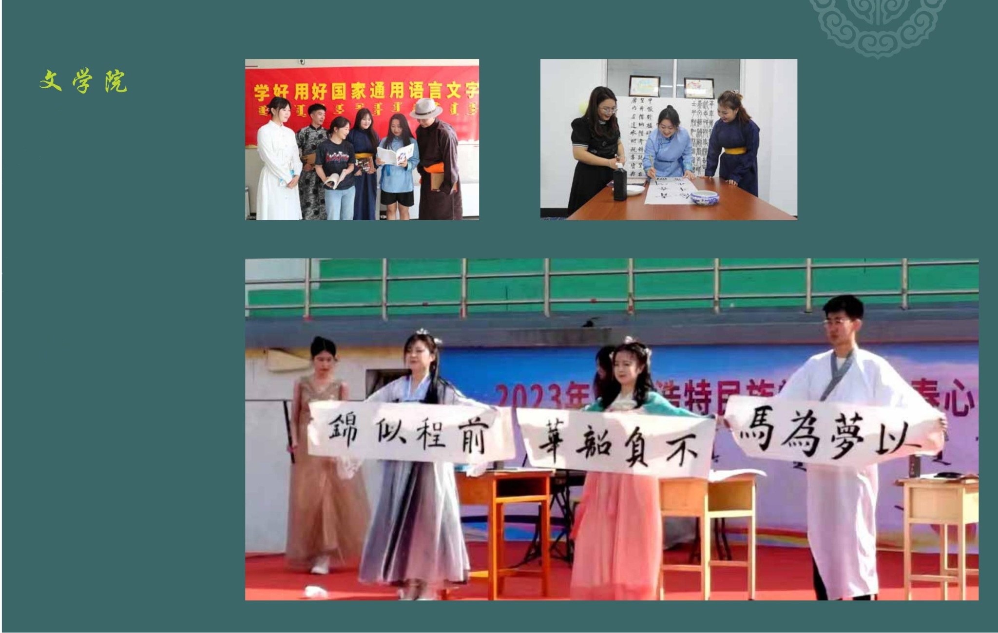 学院设有汉语言文学和汉语国际教育2个师范类本科专业,紧扣国家教育需求与区域发展定位,构建“立足内蒙古、面向八省区、辐射基层”的人才培养体系,以内蒙古农村牧区为主阵地培养中小学语文教师。同时,积极响应国家“一带一路”倡议,为沿线国家培养汉语教师,传播中华文化,促进国际文化交流与合作。现有在校本科生652人。