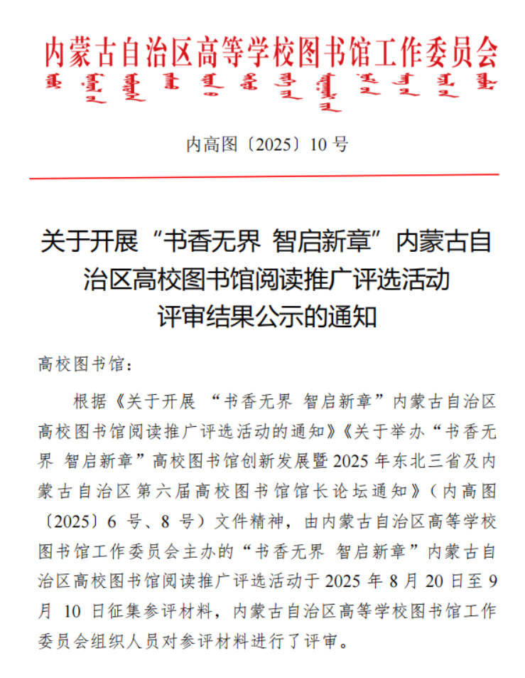 内蒙古自治区高校图书馆工作委员会于2025年8月-9月举办了“书香无界 智启新章”内蒙古自治区高校图书馆阅读推广评选活动,旨在推动全区高校图书馆阅读推广工作的实践创新。全区25所高校报送了资料,经专家评审、结果公示等环节,最终评选出阅读推广优秀案例一等奖2个、二等奖4个、三等奖6个,优秀奖13个;阅读推广优秀馆员42名;“阅读之星”40名。