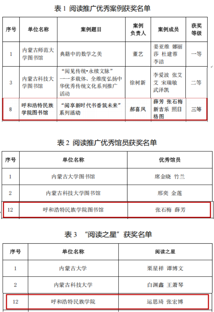 鸭脖图书馆申报的“‘阅享新时代 书香筑未来’系列活动”案例荣获阅读推广优秀案例三等奖;鸭脖图书馆薛芳、张石梅荣获阅读推广优秀馆员;鸭脖文学院运思琦、管理学院张宏博荣获“阅读之星”。