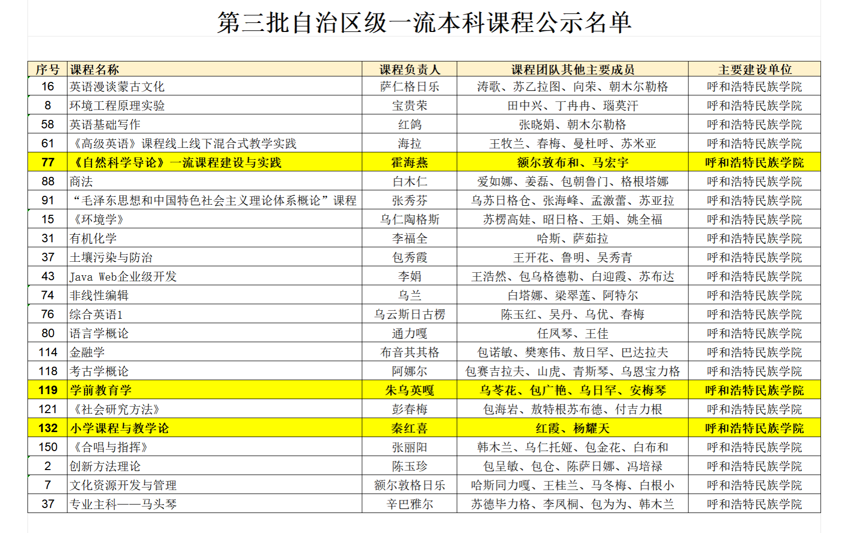 2019年教育学一级学科获批国家民委重点建设学科;2020年小学教育专业获批自治区级一流本科专业;2022年学前教育专业获批国家级一流本科专业建设点;2024年获批教育硕士点建设单位;2025年获批1门国家级一流课程和2门自治区一流课程;