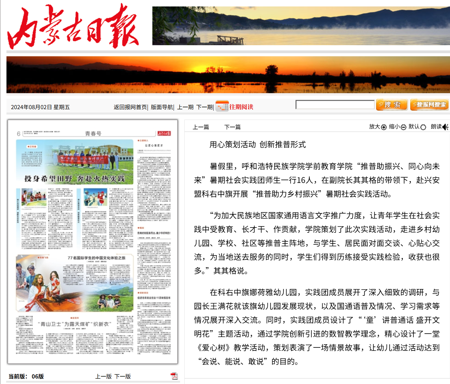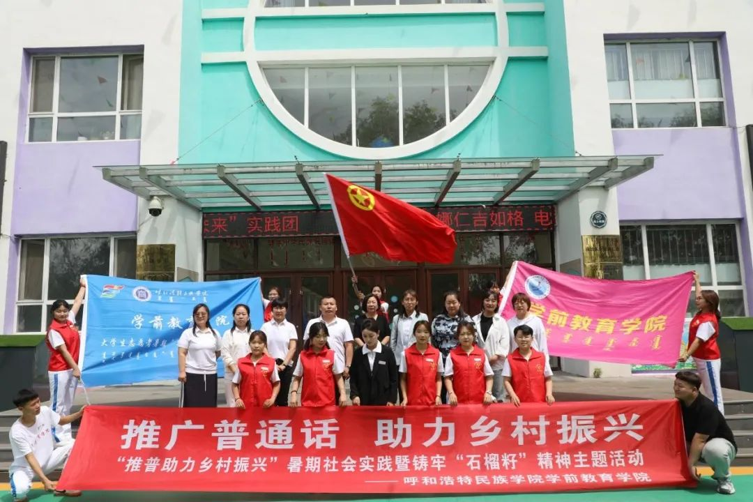 学院以党团班一体化为抓手,聚焦铸牢中华民族共同体意识主线,通过团日活动和学校一站式学生社区建设,构建五育融通、数字赋能的育人新生态。其中五线联动•教育赋能实践团组织47名师生分赴5个盟市,开展普通话推广、民族团结教育等实践活动,累计服务800余人次,获地方政府高度评价,充分彰显实践育人成效。