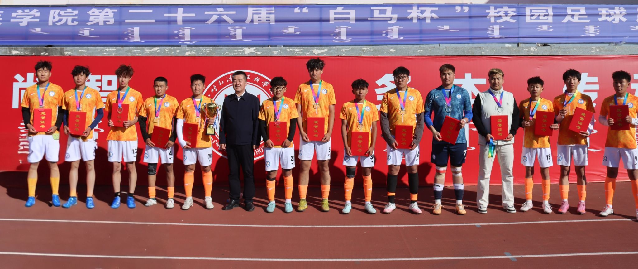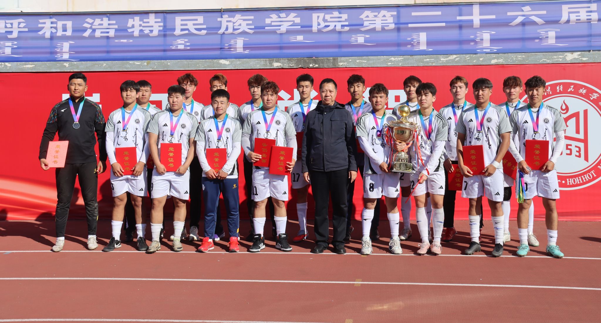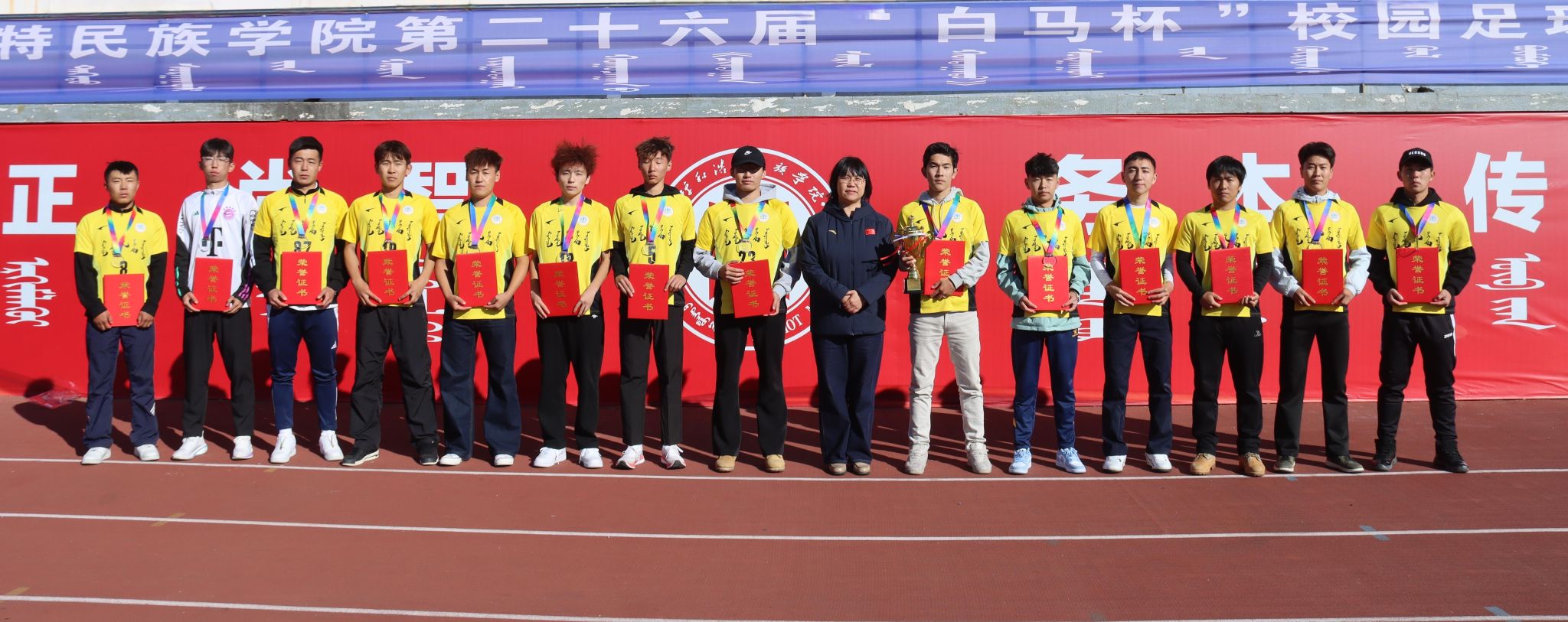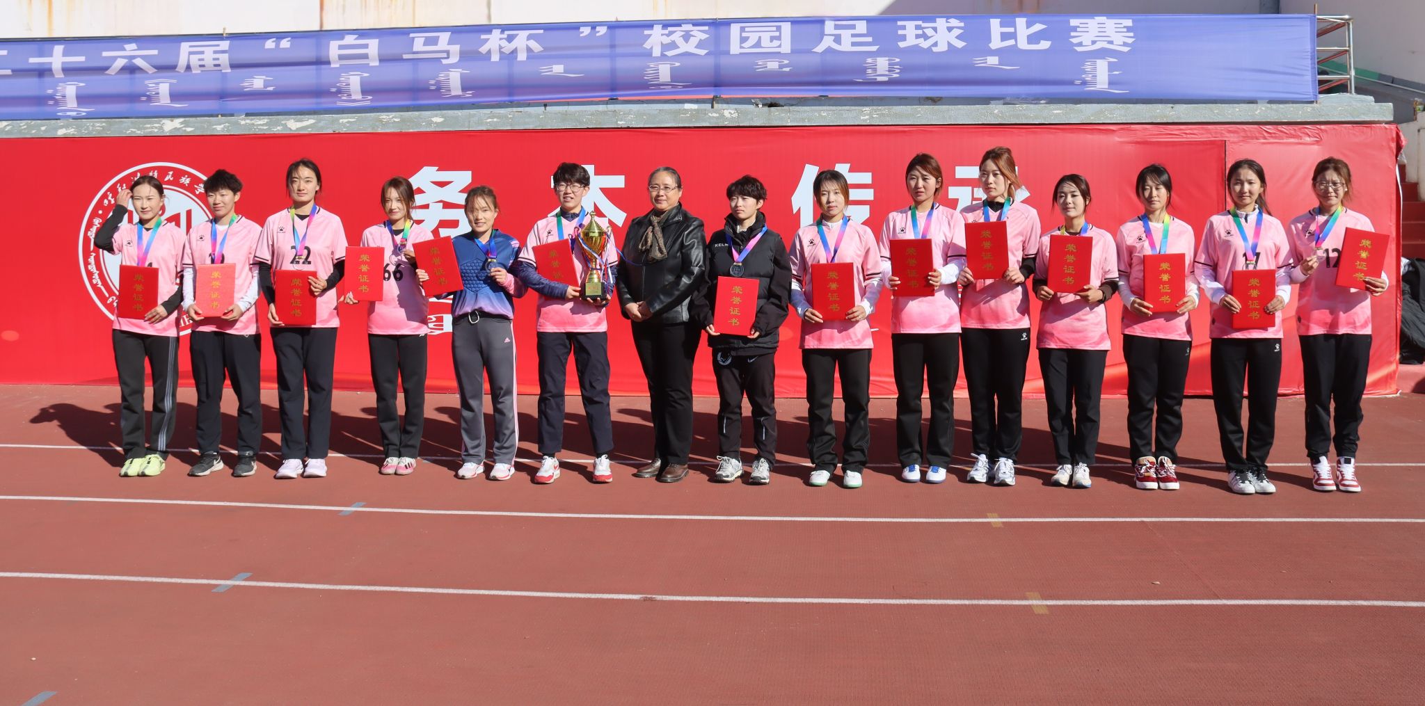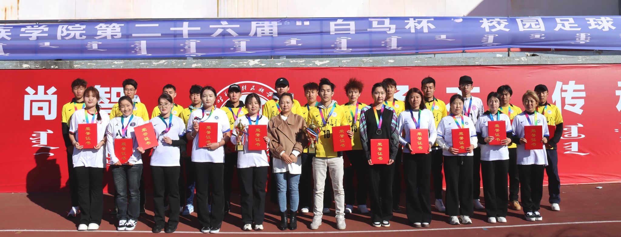 为深化民族团结进步教育,持续推动校园文化建设走深走实,由校团委主办、体育学院承办的第二十六届“白马杯”校园足球赛决赛于10月17日在南操场举行。校党委委员、纪委书记、监察专员王冬梅,校党委委员、副校长双虎出席并为获奖团队颁奖。