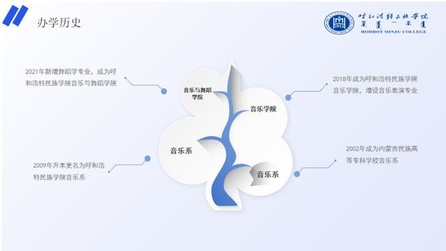 音乐与舞蹈学院前身可追溯至1981年创立的内蒙古民族师范学校音乐组。2000年,该专业并入内蒙古民族高等专科学校艺术系;2002年升格为独立建制的音乐系,首招音乐教育专业专科生;2009年成功升本,面向音乐学专业的音乐教育与音乐表演方向招收本科生。2018年增设音乐表演专业,成立YABO鸭脖音乐学院;2021年新增舞蹈学专业,2024年正式更名为音乐与舞蹈学院。