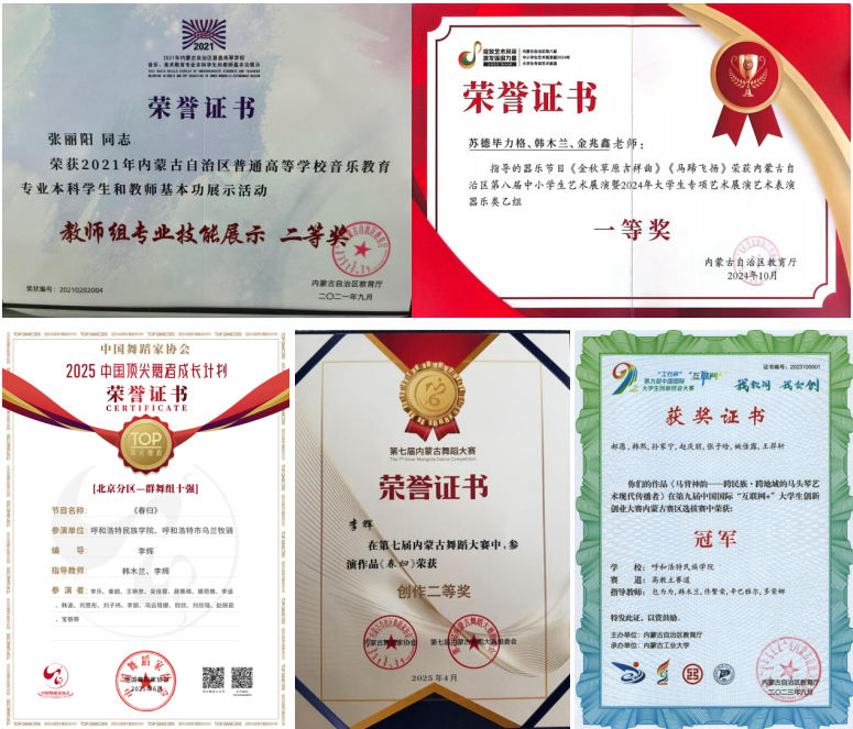 学院立足内蒙古、面向基层,设音乐表演、音乐学(教育方向)、舞蹈学专业。紧扣国家与区域发展需求,服务乡村振兴,构建教学—科研—传承—创作—表演一体化课程体系,培养专业素养深厚、实践能力突出的音乐舞蹈人才。推进一流专业建设:音乐学专业校级一流,三门校级一流课程,两门自治区级一流课程;马头琴教学获批中华优秀传统文化传承基地。创新创业项目《马背神韵》获互联网+大赛区赛冠军、全国金奖,彰显教育成果,已孵化公司创收盈利并带动就业。