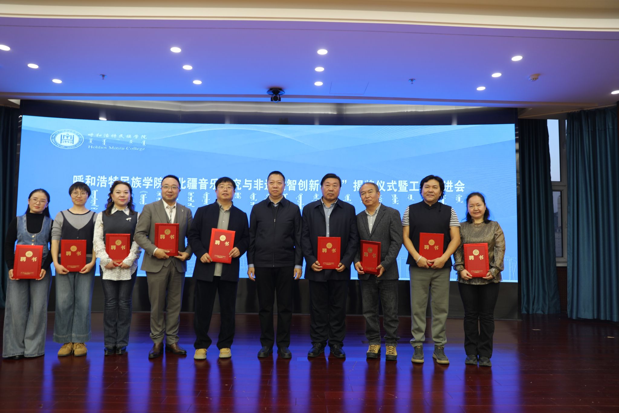 在举行受聘仪式与赠书仪式环节,中心向受聘研究员、团队成员代表、科研助理代表颁发聘书。内蒙古师范大学音乐学院呼格吉勒图教授、内蒙古师范大学音乐学院松波尔教授、内蒙古师范大学音乐学院副院长贺宇教授、内蒙古师范大学音乐学院副院长雅茹副教授、内蒙古艺术学院非遗学院院长史永清教授、内蒙古自治区文化和旅游发展研究院张劲盛评论员、通辽市艺术研究所国家一级评论员叁布拉诺日布教授等专家学者向中心赠送了相关学术书籍。
