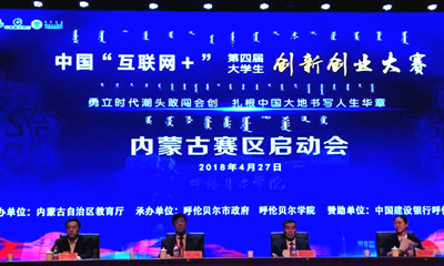 第四届中国‘互联网+’大学生创新创业大赛内蒙古赛区启动会于4月27日,在呼伦贝尔学院召开。自治区43所高校主管校领导,教务、就业等相关部门负责同志,各高校师生代表350余人参加。鸭脖纳丽娜副院长、就业指导中心娜仁其木格副主任参加了启动仪式,创业学生代表高宇江、邰丽丽参加了项目展示。
