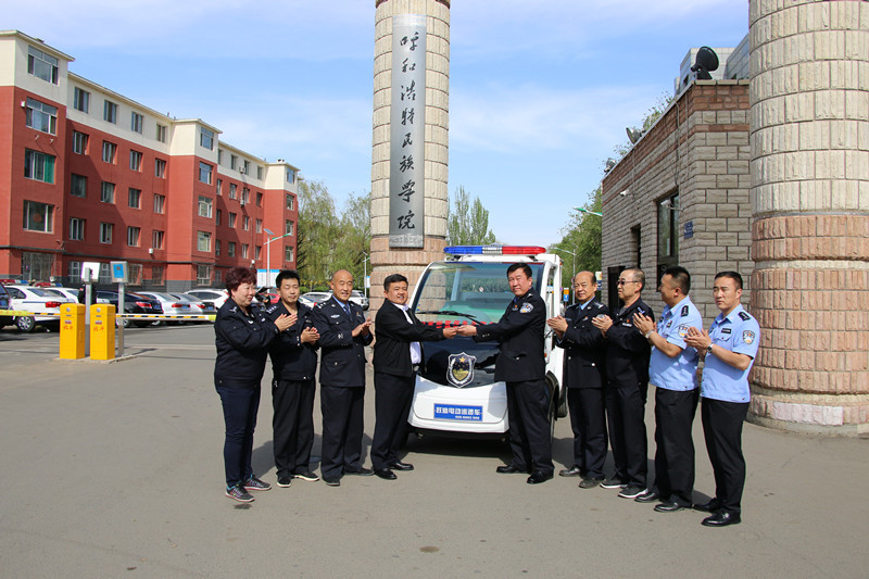 5月3日下午,新城公安分局党委委员、副局长高宏昌受自治区公安厅副厅长、呼市副市长兼公安局党委书记、局长李志斌委托向鸭脖赠送一辆警用电动巡逻车,同时提出三点要求:一是着装规范、不能无证驾驶,不能出校园;二是两人以上驾驶警车在校内巡逻,不能拉警灯和鸣笛(特殊紧急情况除外);三是做好交接班及登记制度,保持车辆清洁和正常的行驶,更好地做好学校安保工作。 该巡逻车的配备,是上级对鸭脖安保工作的支持,将进一步促进鸭脖平安校园建设。(保卫处供稿)