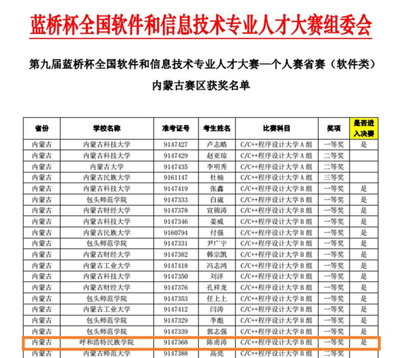 本届大赛分为个人赛和团队赛两大项,个人赛分为软件类、电子类、设计类和少儿创意编程组四大类别。鸭脖选手主要参加的是软件类个人赛并取得了优异的成绩,计算机系的陈甫涛同学获得C/C++程序设计组一等奖;刘雨康同学获得C/C++程序设计组三等奖;卢岩、孙继蕾、韩振疆和王忠盼等4名同学获得Java程序设计组三等奖。获得一等奖的陈甫涛同学将代表学校参加第九届“蓝桥杯”全国软件和信息技术专业人才大赛——个人赛国赛(软件类)。