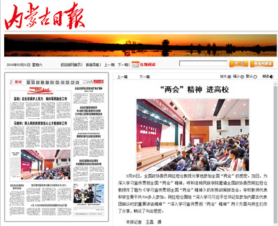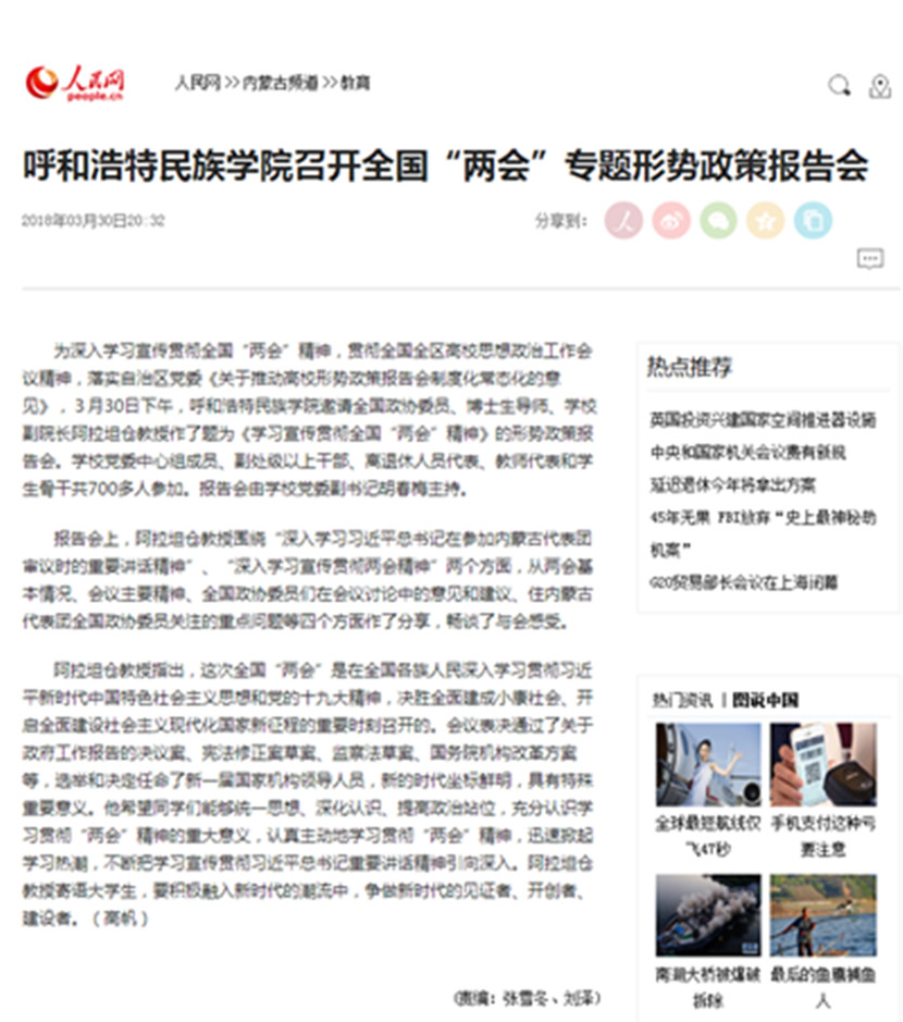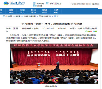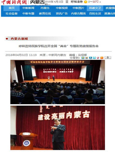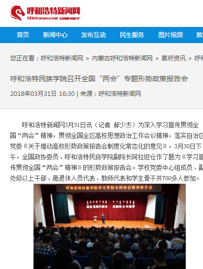 人民网、中国新闻网、《内蒙古日报》(蒙、汉文版)、新华网蒙古文网、内蒙古融媒体、呼和浩特新闻网、内蒙古广播电台蒙古文频道、呼和浩特新闻广播电台、大学生手机报等媒体对形势政策报告会进行了报道,正北方新闻网、内蒙古综合新闻网等媒体进行了转载报道。