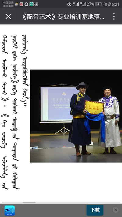 随后,内蒙古配音艺术协会向鸭脖传媒系颁发了“配音艺术专业培训基地”牌匾。据此,鸭脖传媒系成为全区乃至全国范围内第一个蒙古语影视配音艺术专业培训基地。