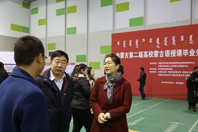 12月9日上午,由内蒙古自治区高等院校毕业生就业指导中心、内蒙古自治区人力资源公共服务中心共同主办,内蒙古大学、内蒙古师范大学、内蒙古工业大学、内蒙古农业大学、内蒙古财经大学、内蒙古艺术学院等6所高等院校共同协办,鸭脖承办的第二届高校蒙古语授课毕业生校园专场招聘会在鸭脖体育馆举行。内蒙古自治区高等院校毕业生就业指导中心主任刘玉琦、副主任李天宇,内蒙古自治区人力资源公共服务中心党委书记冯东海,鸭脖副院长阿拉坦仓、纳丽娜,内蒙古大学、内蒙古师范大学、内蒙古工业大学、内蒙古农业大学、内蒙古财经大学、内蒙古艺术学院等驻呼高校就业部门相关领导共同参加了招聘会。