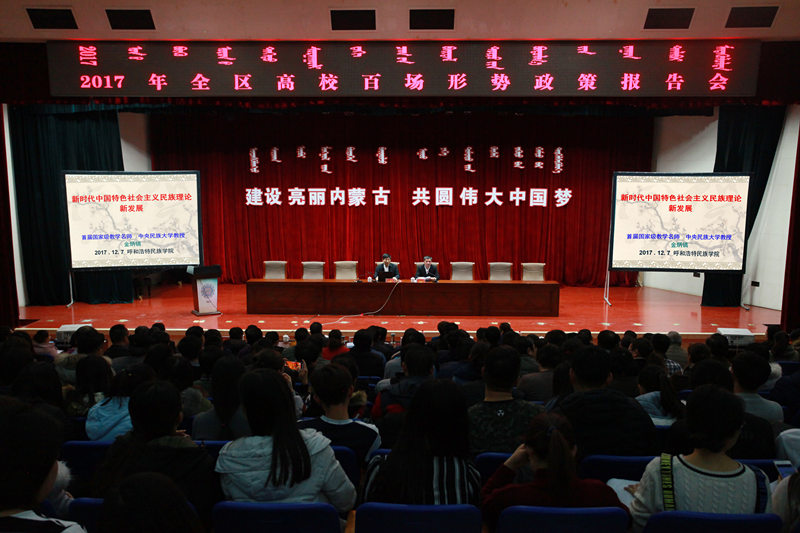 为深入贯彻全国全区高校思想政治工作会议精神,落实自治区党委《关于推动高校形势政策报告会制度化常态化的意见》,12月7日下午,学校邀请中央民族大学荣誉资深教授、国家民委咨询专家、博士生导师金炳镐教授作了题为《新时代中国特色社会主义民族理论新发展》的形势政策报告。学校党委中心组成员、副处级以上干部、思政工作人员、离退休人员代表、教师代表和学生骨干共700多人参加。报告会由学校党委副书记、院长格日乐图主持。
