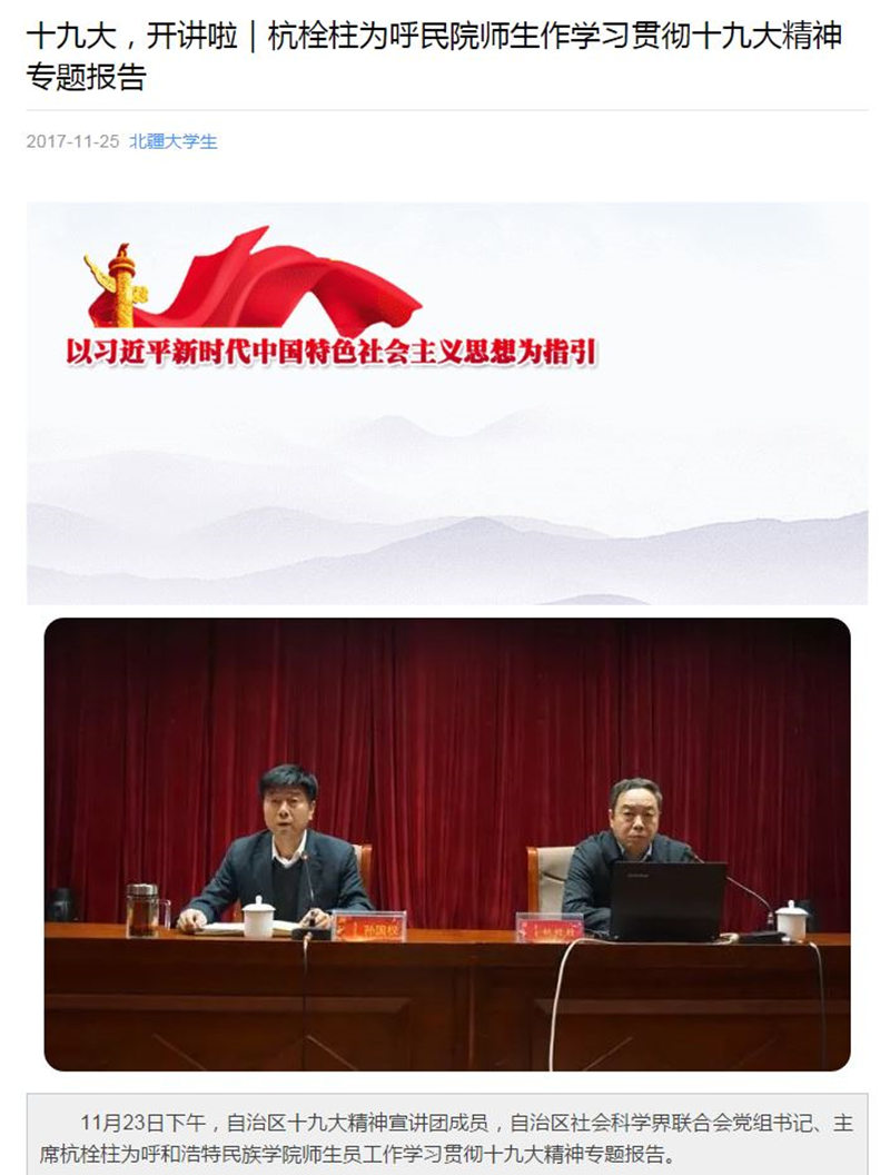 近日,鸭脖邀请自治区十九大精神宣讲团成员、自治区社会科学界联合会党组书记、主席杭栓柱作了题为《夺取新时代伟大胜利的行动纲领》的十九大精神专题报告会。杭栓柱主席的报告不仅在鸭脖引起了热烈反响,还得到了社会主流媒体的广泛关注。