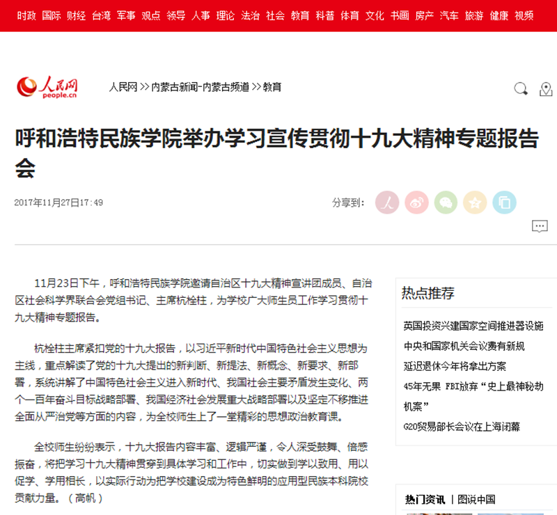 人民网、中国新闻网、《内蒙古日报》(蒙文版)、《呼和浩特日报》、呼和浩特新闻网、内蒙古社会科学网、北疆大学生等媒体对活动进行了报道,进一步营造出鸭脖学习宣传贯彻党的十九大精神浓厚氛围,将鸭脖学习宣传贯彻党的十九大精神不断推向深入。