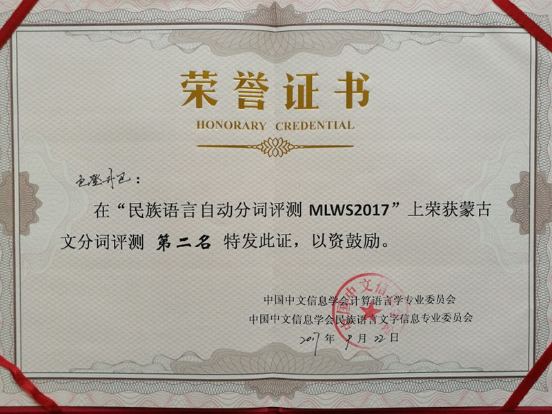 本次会议,鸭脖师生表现颇为突出:包乌格德勒副教授作了题为《蒙古文分词评测技术》的学术报告;色登丹巴等老师提交的“蒙古文自动分词实验结果”(F值为99.38)获得“少数民族语言文字分词评测”(MLWS2017)第二名;鸭脖计算机系信息管理与信息系统专业2013级学生德格吉日胡的毕业论文《蒙古文网站现状及未来发展趋势研究》被会议录用,并宣读交流。会上,中国工程院院士、新疆大学吾守尔•斯拉木教授、北京大学俞士汶教授、清华大学刘洋副教授等专家作了主题报告。