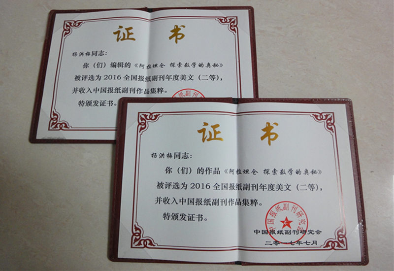 2016年度全国报纸副刊优秀作品评选活动近日揭晓,由《内蒙古日报》对鸭脖副院长阿拉坦仓教授进行访谈编辑的作品《阿拉坦仓 探索数学的奥秘》获2016全国报纸副刊年度美文(二等)奖,并收入中国报纸报刊作品集粹。