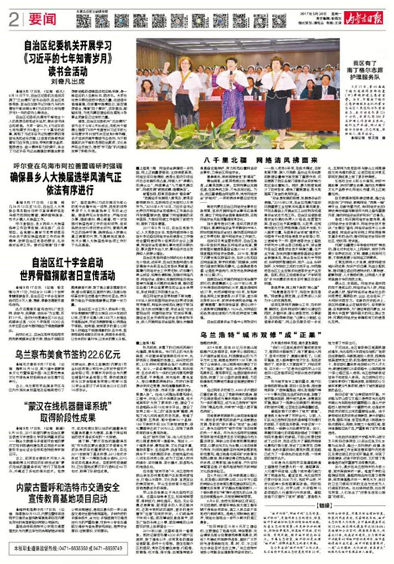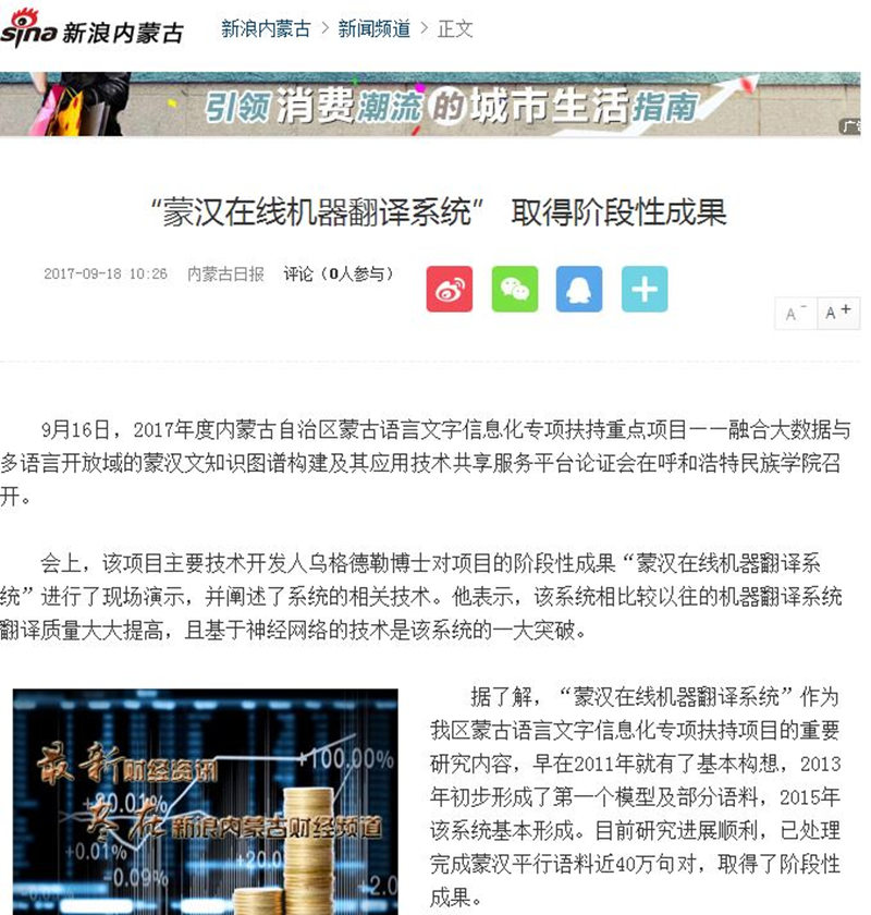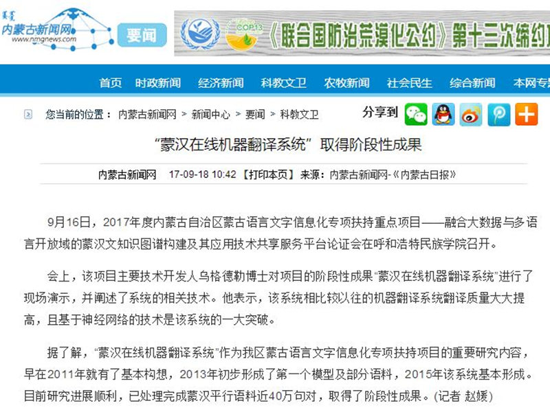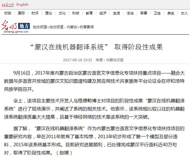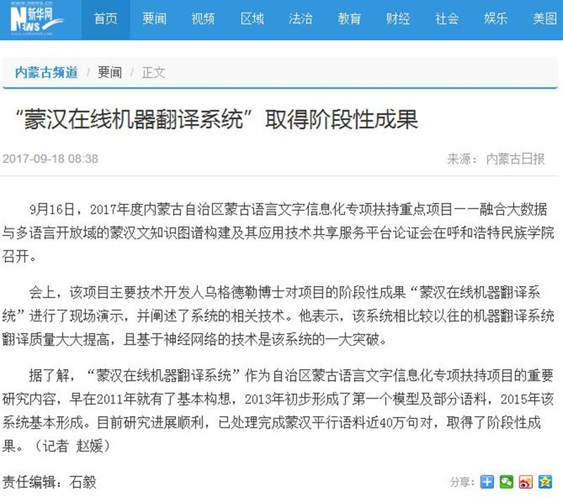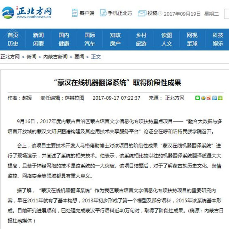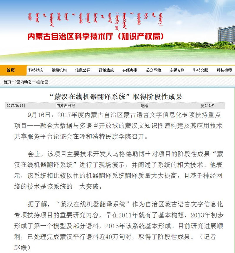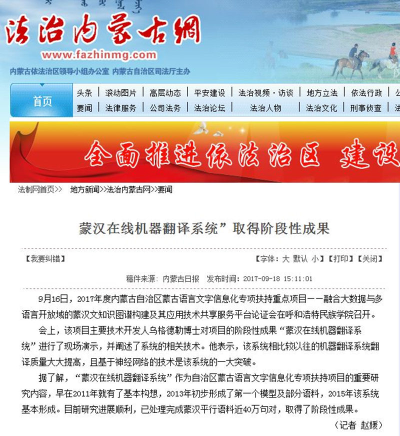 2017年9月16日,2017年度内蒙古自治区蒙古语言文字信息化专项扶持重点项目—“融合大数据与多语言开放域的蒙汉文知识图谱构建及其应用技术共享服务平台”论证会在鸭脖召开。会前,校党委宣传部专门邀请新华社内蒙古分社、内蒙古电视台、内蒙古日报、内蒙古广播电台蒙古语广播、内蒙古晨报、呼和浩特日报、中国蒙古语新闻网等主流媒体记者到校进行采访,受邀媒体在会后及时刊发了新闻,其中内蒙古日报蒙文报、内蒙古日报汉文报均在第2版进行报道。