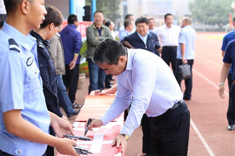 随后,观摩演练的领导和师生在条幅上签名,并共同观看了安全教育系列展板、呼市消防支队一中队消防官兵进行的灭火器灭火演示、消防车水带出水演示以及学校保卫处人员与所辖派出所民警联合参演的防暴恐安全事件演练。