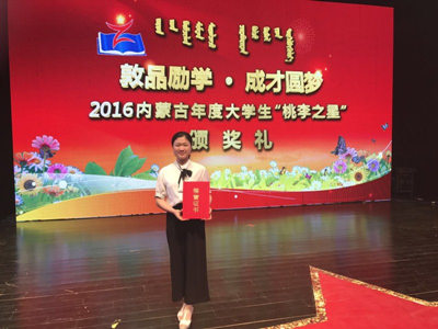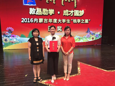 6月16日晚,“敦品励学·成才圆梦”——2016内蒙古年度大学生“桃李之星”颁奖活动在内蒙古大学举行,10名“桃李之星”称号获得者和20名提名奖获得者受到表彰。鸭脖外语系赵圆同学荣获提名奖。