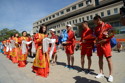 上午9时30分,鸭脖在天骄广场举行了隆重热烈、俭朴简约的欢迎仪式。由学生代表自发组织的迎接队伍,在悠扬的马头琴、呼麦和长调声中,为领队、教练员、运动员敬献了哈达、马奶及鲜花。