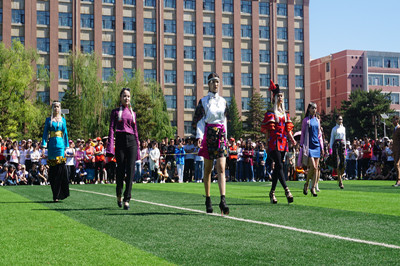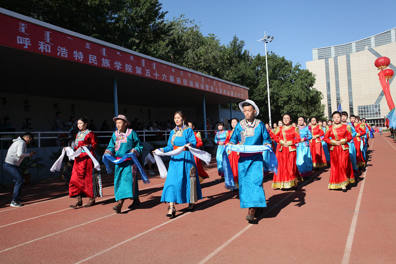 开幕式上,由国旗队、仪仗队、师生民族体育代表方队、各系代表队、裁判方队等组成的入场队伍,身着特色服装,高举象征民族图腾的苏鲁定旗帜,逐一经过主席台接受检阅。