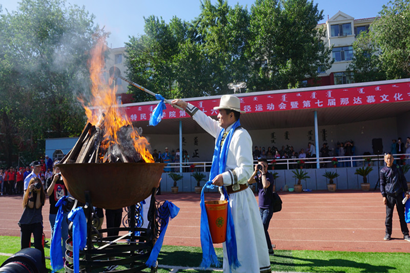 接着,举行火炬接力与祭火仪式。由孙国权书记点燃火炬,各系火炬手接力传递,随后点燃圣火盆,并由格日乐图院长祭旺圣火。