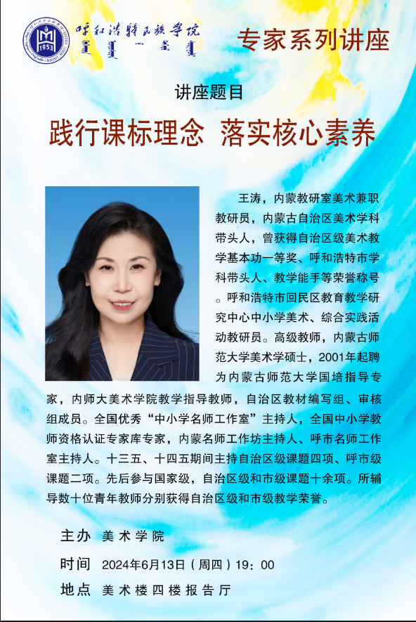 王涛,内蒙教研室美术兼职教研员,内蒙古自治区美术学科带头人,曾获得自治区级美术教学基本功一等奖、呼和浩特市学科带头人、教学能手等荣誉称号。呼和浩特市回民区教育教学研究中心中小学美术、综合实践活动教研员。高级教师,内蒙古师范大学美术学硕士,2001年起聘为内蒙古师范大学国培指导专家,内师大美术学院教学指导教师,自治区教材编写组、审核组成员。全国优秀“中小学名师工作室”主持人,全国中小学教师资格认证专家库专家,内蒙名师工作坊主持人、呼市名师工作室主持人。十三五、十四五期间主持自治区级课题四项、呼市级课题二项。先后参与国家级,自治区级和市级课题十余项。所辅导数十位青年教师分别获得自治区级和市级教学荣誉。