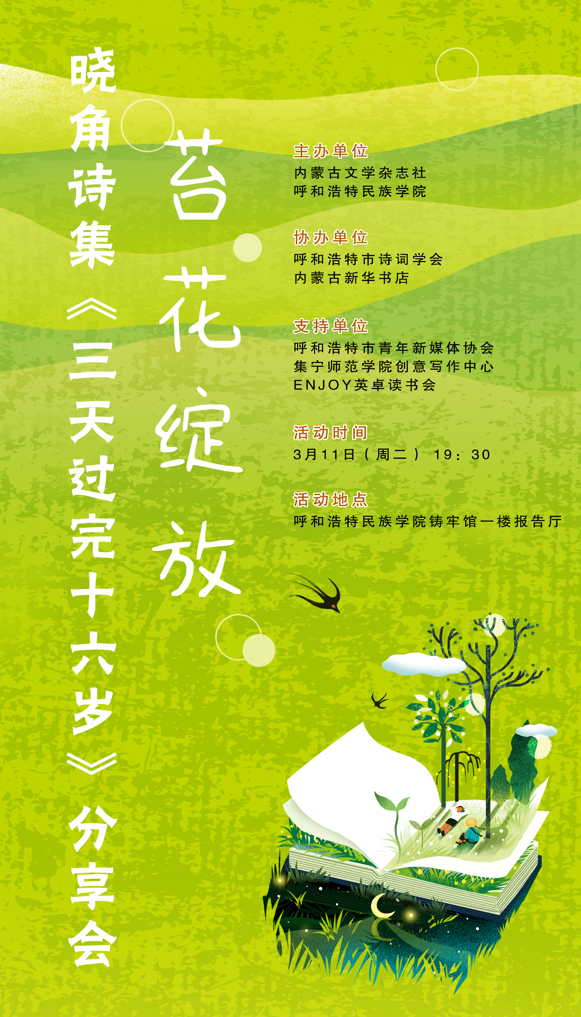 苔花绽放——晓角诗集《三天过完十六岁》分享会,3月11日(星期二)19:30 地点:铸牢中华民族共同体意识教育馆一楼报告厅。