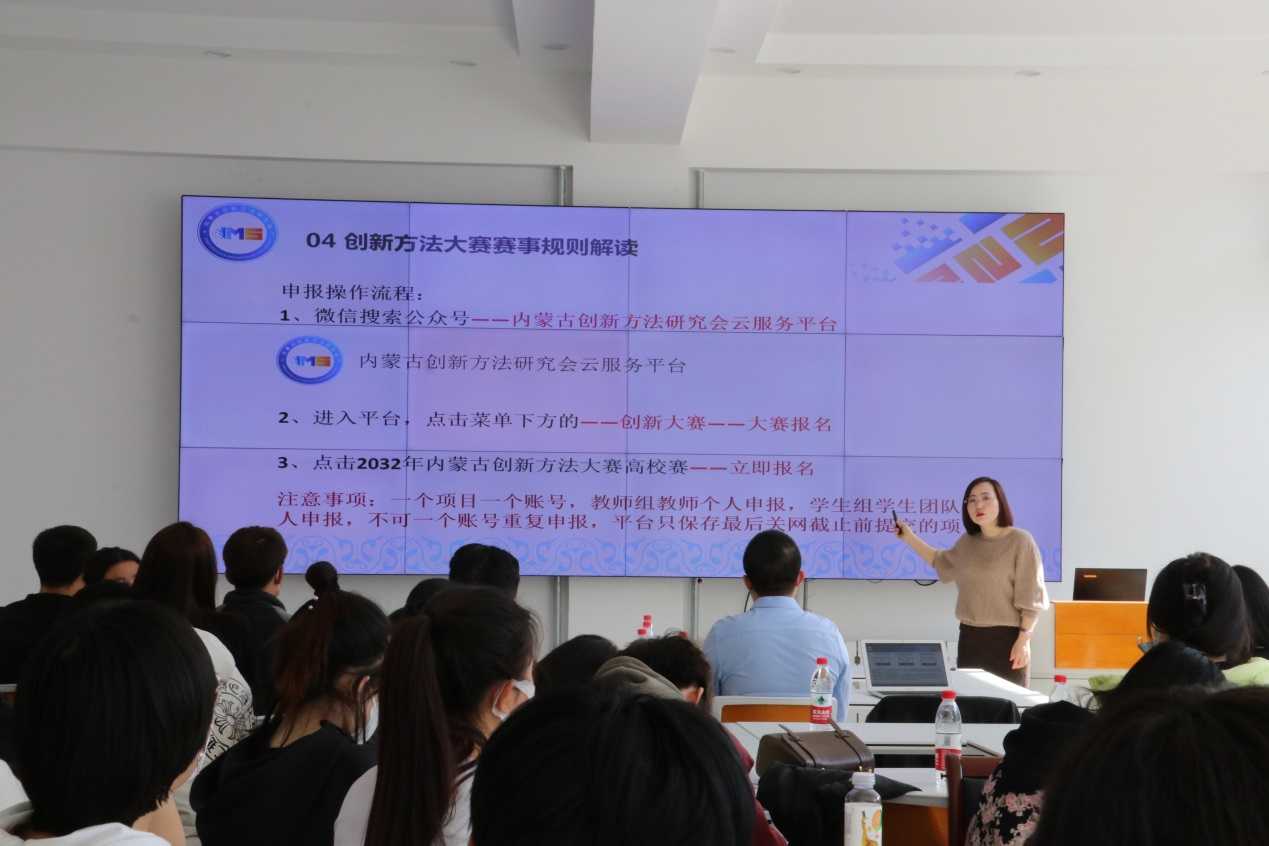 本次培训特邀国家三级创新工程师、国家一级创新方法培训师、内蒙古创新方法研究会专家库成员、包头轻工职业学院刘小兰副教授进行授课,通过创新方法推广应用典型案例、Triz创新方法核心内容与实践相结合、专创融合课程的设计及应用,使学生进一步理解创新方法和备赛事宜。内蒙古创新方法研究会战略发展部部长王强就赛后如何提升项目质量对接企业、如何推广等方面进行了说明;内蒙古创新方法研究会副秘书长樊华介绍了内蒙古高校创新方法工作的现状。
