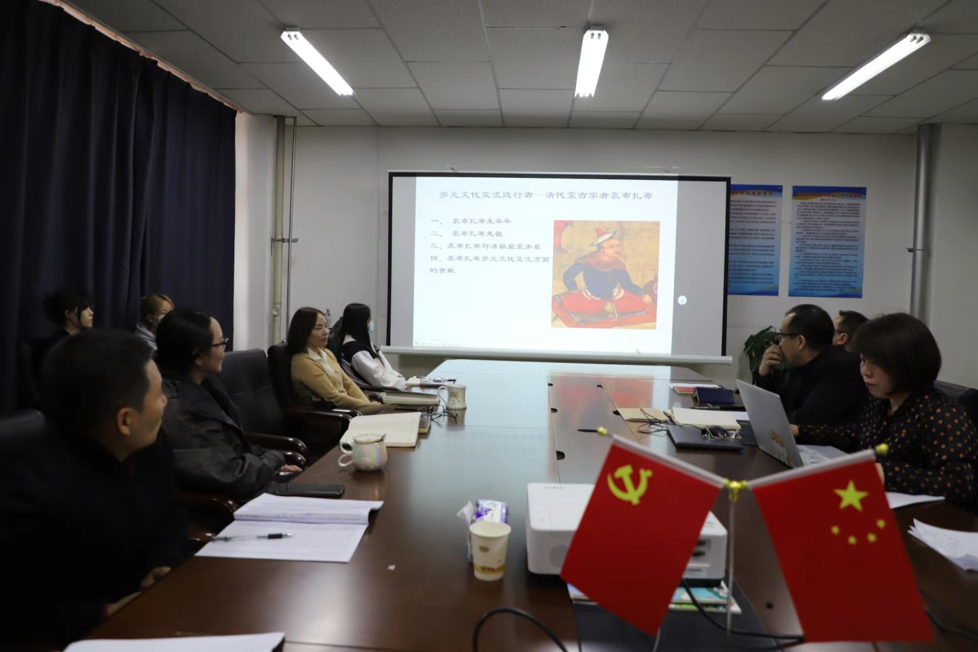 2023年4月20日下午3点在尚智楼316会议室举行了民族学学院“敕勒川”系列学术讲座。本次讲座由民族学学院副教授风晓博士主讲,题目为《多元文化交流践行者—清代蒙古学者衮布扎布》,由民族学学院乌恩宝力高博士主持。 风晓博士从“多元文化交流”概念入手,结合翔实的档案史料,考证了清代精通满蒙汉藏多种语言的学者衮布扎布生卒年、身份地位及其在我国多民族交往交流交融领域做出的历史贡献。来自相关学院近40名师生聆听讲座,并进行了现场互动。
