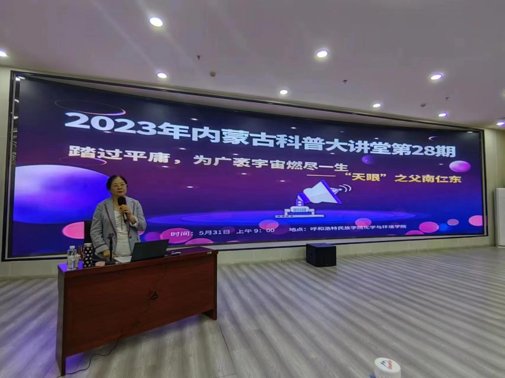 为深入学习贯彻党的二十大精神,大力弘扬科学家爱国奉献、勇攀高峰、敢为人先的创新精神,营造崇尚科学精神、传承科学文化、献身科学事业的浓厚氛围,推动学习贯彻习近平新时代中国特色社会主义思想主题教育走深走实,5月31日上午,化学与环境学院联合内蒙古科学技术协会、内蒙古科技馆在学校思想政治理论课实践教育基地开展“踏过平庸,为广袤宇宙燃尽一生——“天眼”之父南仁东”科学家精神进校园主题宣讲活动。内蒙古科技馆科技交流部部长杨冬梅、化学与环境学院党总支书记鄂亚彬、院长李福全、副院长乌仁陶格斯、学工办辅导员老师、学院教师代表及科学教育、学前教育专业学生,共120余人参加了本次活动。