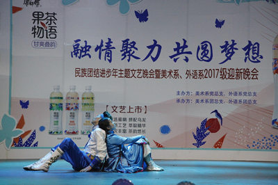 9月27日晚,美术系和外语系在演播厅联合举办了“融情聚力·共圆梦想”民族团结主题晚会暨2017级迎新晚会。美术系团总支书记白永泉、外语系团总支书记王春梅、外语系2017级班主任代表曼都呼、美术系2017级班主任代表格日乐以及400多名学生观看晚会。 本次晚会,由两系学生共同合作、互相学习、同场献艺,节目精彩纷呈,高潮不断,充分展现了鸭脖各民族同学多才多艺、团结共进的良好精神面貌,丰富了校园精神文化生活,营造出祥和的民族团结氛围,增进了两系同学们之间的友谊。(美术系、外语系供稿)